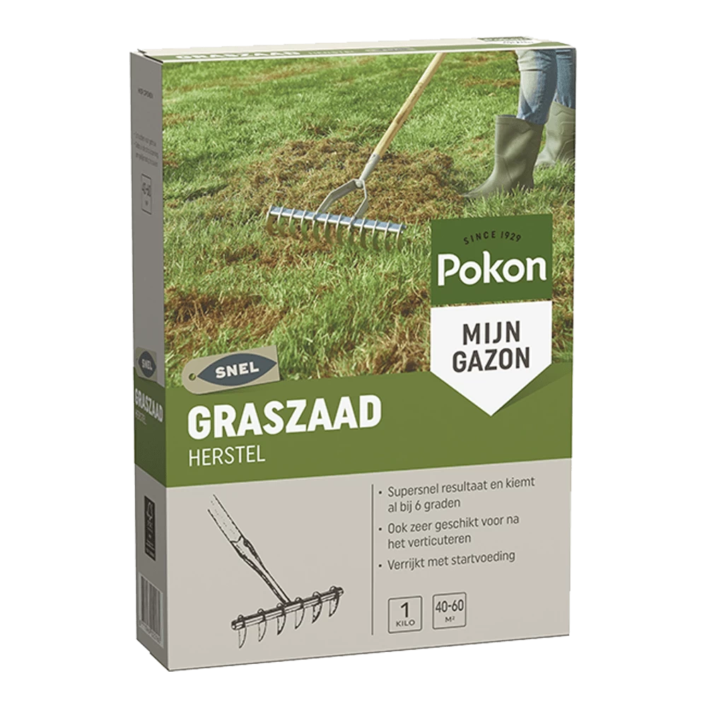 Pokon Graszaad Herstel is geschikt voor het herstel van je gazon, zowel van kale plekken als na het verticuteren. Met dit speciale SOS-graszaad wordt je gazon weer supersnel egaal groen. Het graszaad kiemt al na 1 week, zelfs bij een bodemtemperatuur van 6°C. Pokon Graszaad Herstel is ideaal als snelle oplossing, ook in de herfst- en wintermaanden. Voor een optimale ontkieming is het van belang dat de grond niet te koud is (+6°C.) en dat de buitentemperatuur hoger is dag 15°C (max 25°C). Zaai in een vochtige grond en bij windstil weer. Wanneer er geen regen is gevallen, besproei dan eerst de grond. Zaai het graszaad gelijkmatig en niet te dicht op elkaar, dit belemmert de ontwikkeling. Kiemduur is 1 tot 2 weken, afhankelijk van lucht- en bodemtemperatuur en hoeveelheid vocht. Zorg ervoor dat de grond na het zaaien de eerste 2 tot 4 weken vochtig blijft door voorzichtig en gelijkmatig te sproeien. Droogt de bovenlaag uit, dan mislukt de kieming of sterven de kleine grasplantjes af.