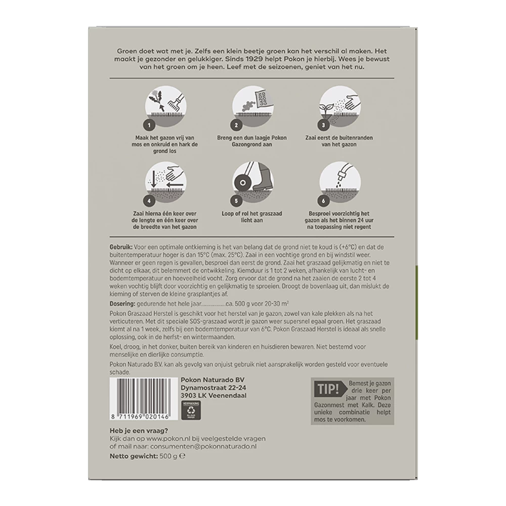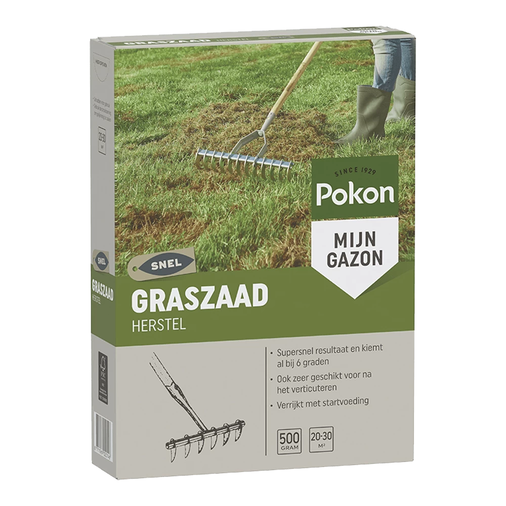 Pokon Graszaad Herstel is geschikt voor het herstel van je gazon, zowel van kale plekken als na het verticuteren. Met dit speciale SOS-graszaad wordt je gazon weer supersnel egaal groen. Het graszaad kiemt al na 1 week, zelfs bij een bodemtemperatuur van 6°C. Pokon Graszaad Herstel is ideaal als snelle oplossing, ook in de herfst- en wintermaanden. Voor een optimale ontkieming is het van belang dat de grond niet te koud is (+6°C.) en dat de buitentemperatuur hoger is dag 15°C (max 25°C). Zaai in een vochtige grond en bij windstil weer. Wanneer er geen regen is gevallen, besproei dan eerst de grond. Zaai het graszaad gelijkmatig en niet te dicht op elkaar, dit belemmert de ontwikkeling. Kiemduur is 1 tot 2 weken, afhankelijk van lucht- en bodemtemperatuur en hoeveelheid vocht. Zorg ervoor dat de grond na het zaaien de eerste 2 tot 4 weken vochtig blijft door voorzichtig en gelijkmatig te sproeien. Droogt de bovenlaag uit, dan mislukt de kieming of sterven de kleine grasplantjes af.