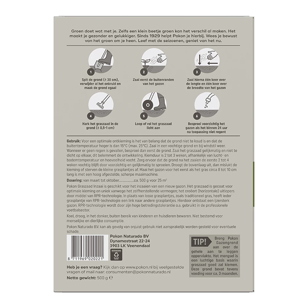 Pokon Graszaad Inzaai is geschikt voor het inzaaien van een nieuw gazon. Het graszaad is gecoat voor optimale kieming en uniek vanwege het zelfherstellende vermogen; het creëert (horizontale) uitlopers door middel van RPR-technologie. In plaats van losse grasplantjes, zoals traditioneel gras, heeft ieder grasplantje van RPR-technologie een link naar andere grasplantjes. Hierdoor ontstaat een ijzersterk gazon, RPR-technologie wordt door zijn betredingstolerantie o.a. gebruikt in de professionele voetbalsector. Voor een optimale ontkieming is het van belang dat de grond niet te koud is en dat de buitentemperatuur hoger is dan 15°C (max. 25°C). Zaai in een vochtige grond en bij windstil weer. Wanneer er geen regen is gevallen, besproei dan eerst de grond. Zaai het graszaad gelijkmatig en niet te dicht op elkaar, dit belemmert de ontwikkeling. Kiemduur is 2 tot 3 weken, afhankelijk van lucht- en bodemtemperatuur en hoeveelheid vocht. Zorg ervoor dat de grond na het zaaien de eerste 2 tot 4 weken vochtig blijft door voorzichtig en gelijkmatig te sproeien. Droogt de bovenlaag uit, dan mislukt de kieming of sterven de kleine grasplantjes af. Maai het gazon voor het eerst als het gras circa 8 tot 10 cm lang is met een hoog afgestelde, scherpe maaimachine.