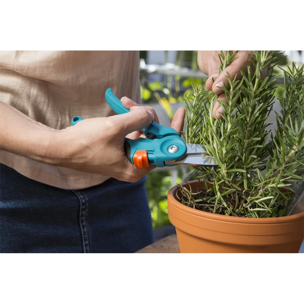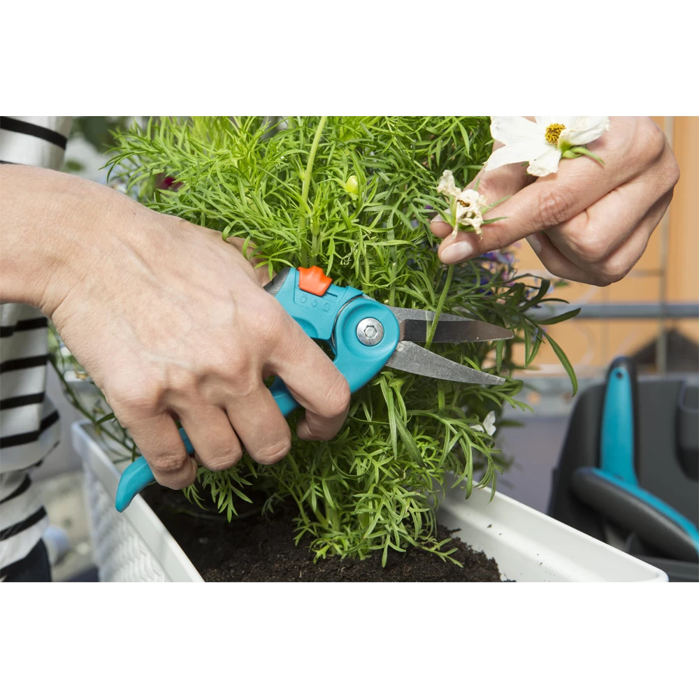 De GARDENA Balkon Snoeischaar is ideaal voor het gebruik op balkons en terrassen. De snoeischaar is perfect voor het snoeien van bloemen, kruiden, dunne takken en nog veel meer. De bladen zijn gemaakt van hoogwaardig roestvrijstaal. De scharen hebben twee verstelbare handgreepposities en een veiligheidsslot.