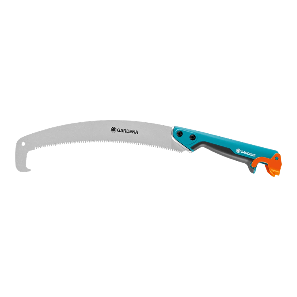 De GARDENA combisystem snoeizaag 300 PP, gebogen, met een zaagblad van 315 mm kan flexibel worden gebruikt afhankelijk van waar u wilt zagen: als u takken onder handbereik wilt zagen, gebruikt u de snoeizaag eenvoudig als “normale” handzaag. De zaag ligt goed in de hand dankzij het ergonomische handvat met softgrip componenten. Als u takken tot een hoogte van 5 meter wilt afzagen, vergroot u het bereik van de snoeizaag door een combisystem telescoop steel te gebruiken. Praktisch: plaats de combisystem steel eenvoudig op de zaag. De veiligheidsvergrendeling garandeert een muurvaste verbinding. Gezette zaagtanden met impulsgeharde tandpunten, aan beide zijden geslepen zorgen voor veilig zagen. Dankzij een speciale coating, is de CS snoeizaag 300 PP, gebogen, optimaal beschermd tegen roest. Een stop op het uiteinde van het handvat beschermt uw hand tegen wegglijden, ook bij trekkende bewegingen. Afgezaagde takken kunnen eenvoudig weggehaald worden met de takhaak aan de bovenzijde van het zaagblad. Met ophangoogje en mesbeschermer om de zaag veilig te kunnen opbergen.